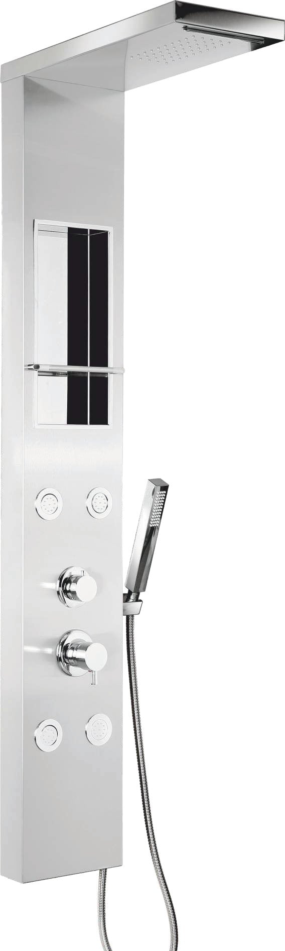 Colonna doccia multifunzione 4 funzioni selezionabili tra: soffione, getto effetto cascata, doccetta e getti orizzontali “massage” superiori e inferiori Flessibile in acciaio inox doppia aggraffatura estensibile cm 150÷200 Pressione Min 1,5 bar - Max 5,0 bar Con vano porta oggetti con specchio integrato, Doccetta e soffione con tettarelle anticalcare, Getto pioggia e cascata verticale, Materiale in Inox 18/10