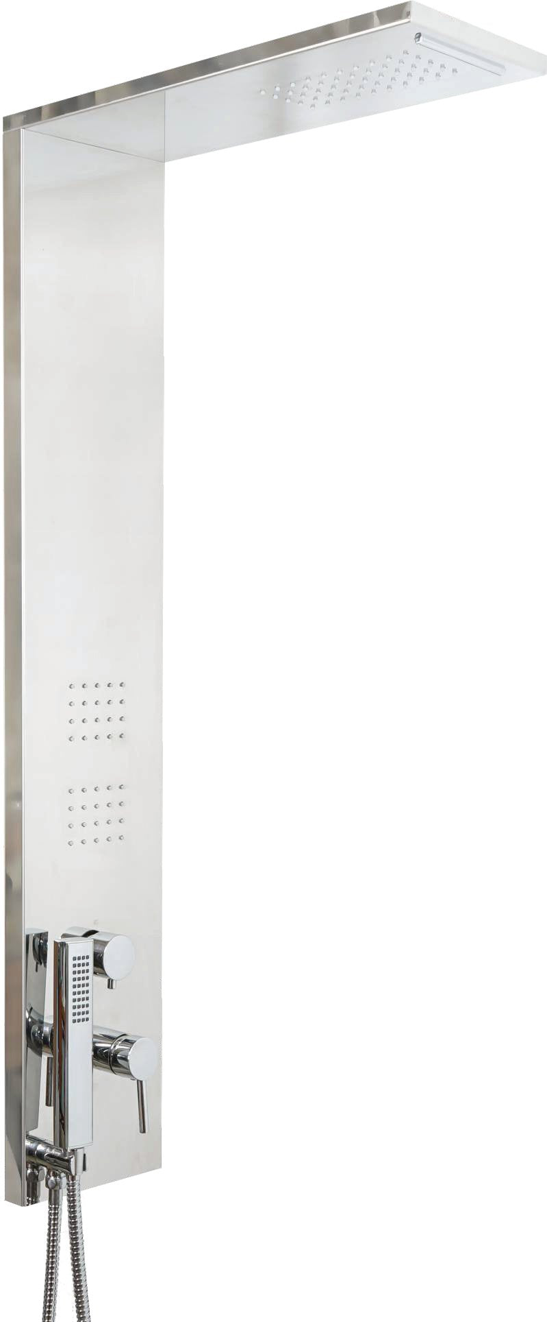 Colonna doccia multifunzione 4 funzioni selezionabili tra:soffione, getto effetto cascata, doccetta e getti orizzontali “massage” Con flessibile in acciaio inox doppia aggraffatura estensibile cm 150÷200 Pressione Min 1.5 bar - Max 5.0 bar Anticalcare, Getto pioggia e cascata verticale, Materiale in Inox 18/10