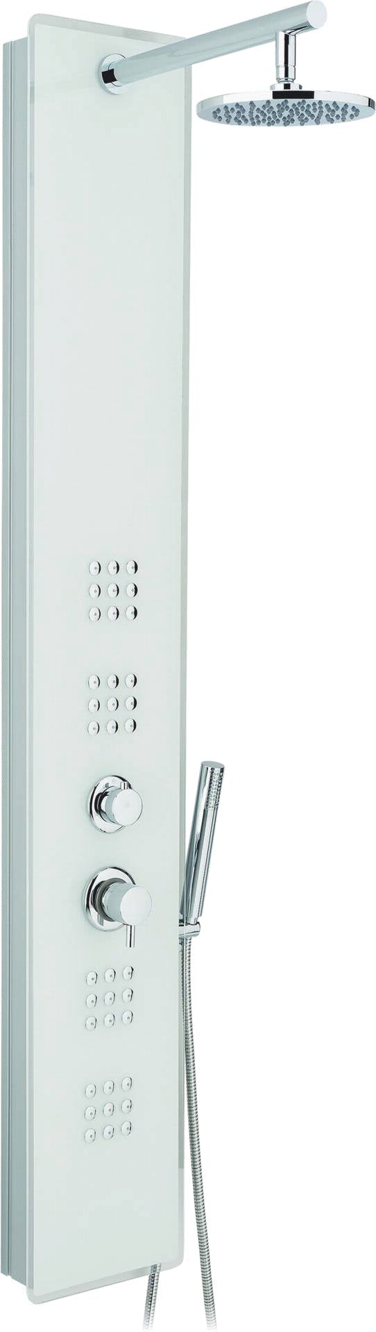 Colonna doccia multifunzione 3 funzioni selezionabili tra: soffione, doccetta e getti orizzontali “massage” superiori e inferiori Flessibile in acciaio inox doppia aggraffatura estensibile cm 150÷200 Pressione Min 1,5 bar - Max 5,0 bar Soffione e doccetta con tettarelle Anticalcare, Braccio doccia in ottone, Getto pioggia e cascata verticale