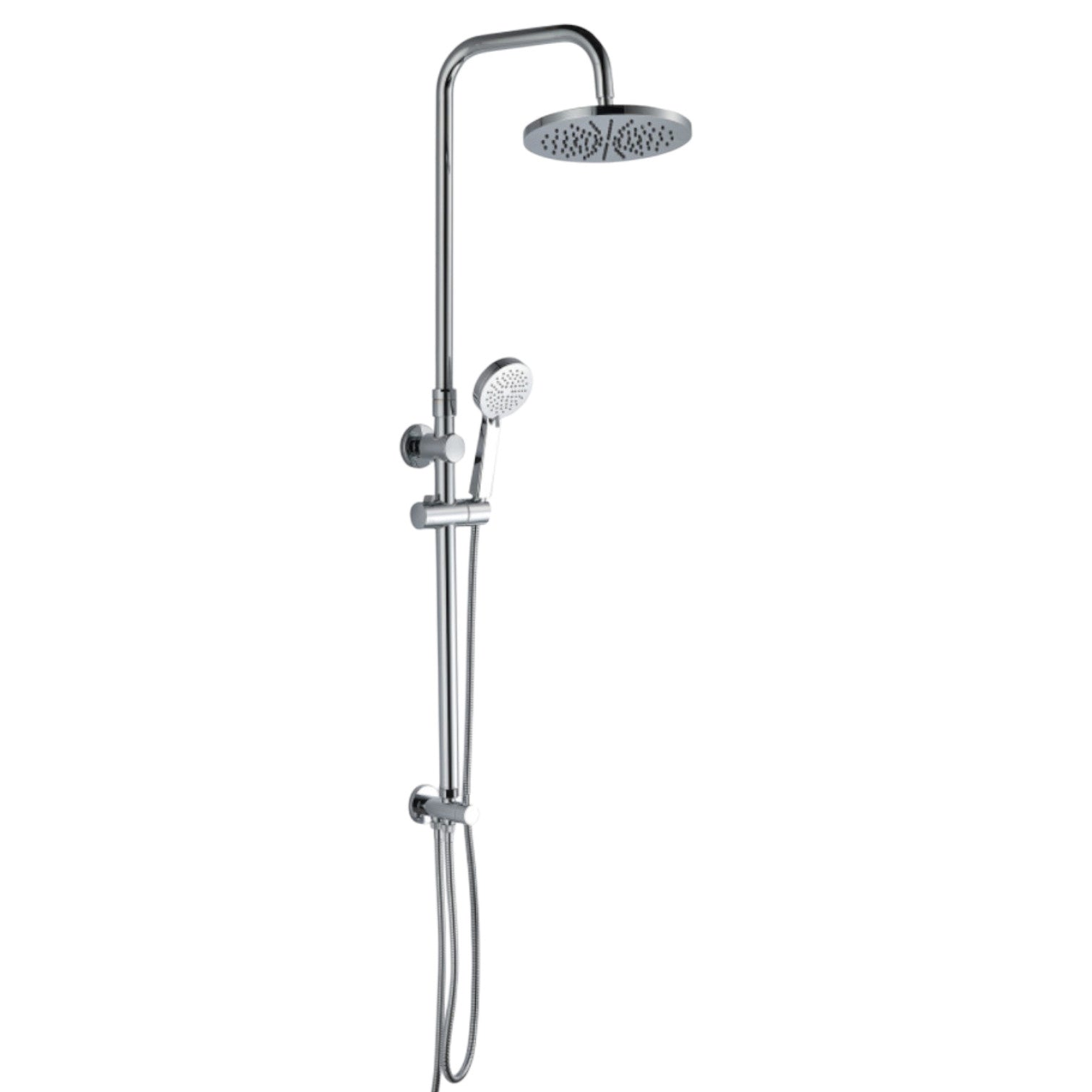 Colonna doccia, acciaio SS304, finitura cromo, soffione Abs Ø 25 cm, 1 getto anticalcare, doccetta Abs 3 getti anticalcare, asta doccia Ø 32 mm, estensibile min. 75- max. 130 cm, fissaggio superiore regolabile in altezza e profondità, flessibile in metallo doppia aggraffatura 1500 mm, deviatore ceramico in ottone