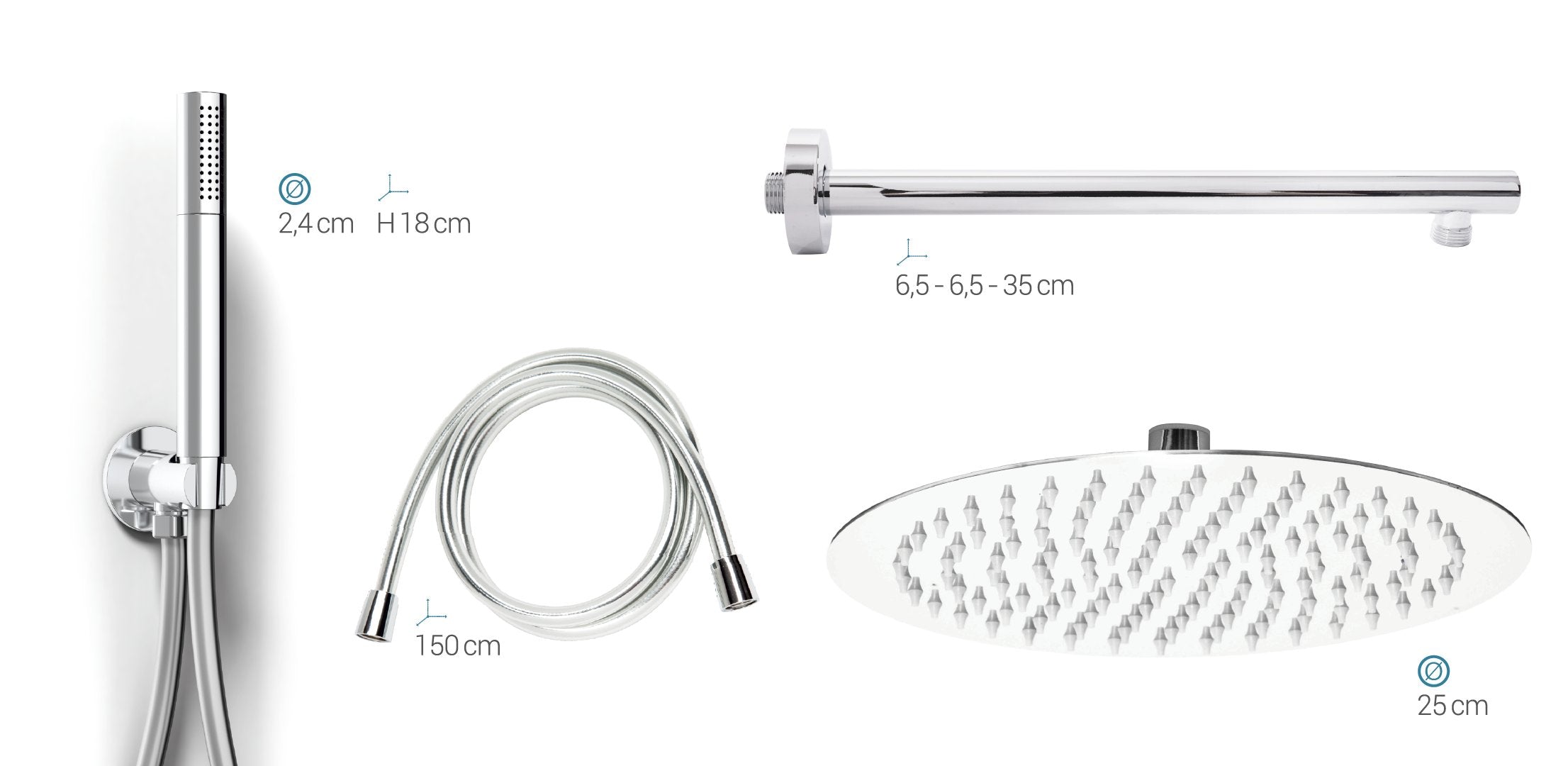 Kit doccia completo stile tondo Con soffione da Ø 25 cm e tettarelle anticalcare, Braccio doccia Inox 18/10 (ss AISI 304), Doccetta monogetto ispezionabile e supporto con presa acqua 1/2" in ottone, Flessibile in PVC 10 anni di garanzia, Risparmio acqua (grazie all’applicazione di una guarnizione aggiuntiva, inclusa nel pack, è possibile ridurre il consumo di acqua),