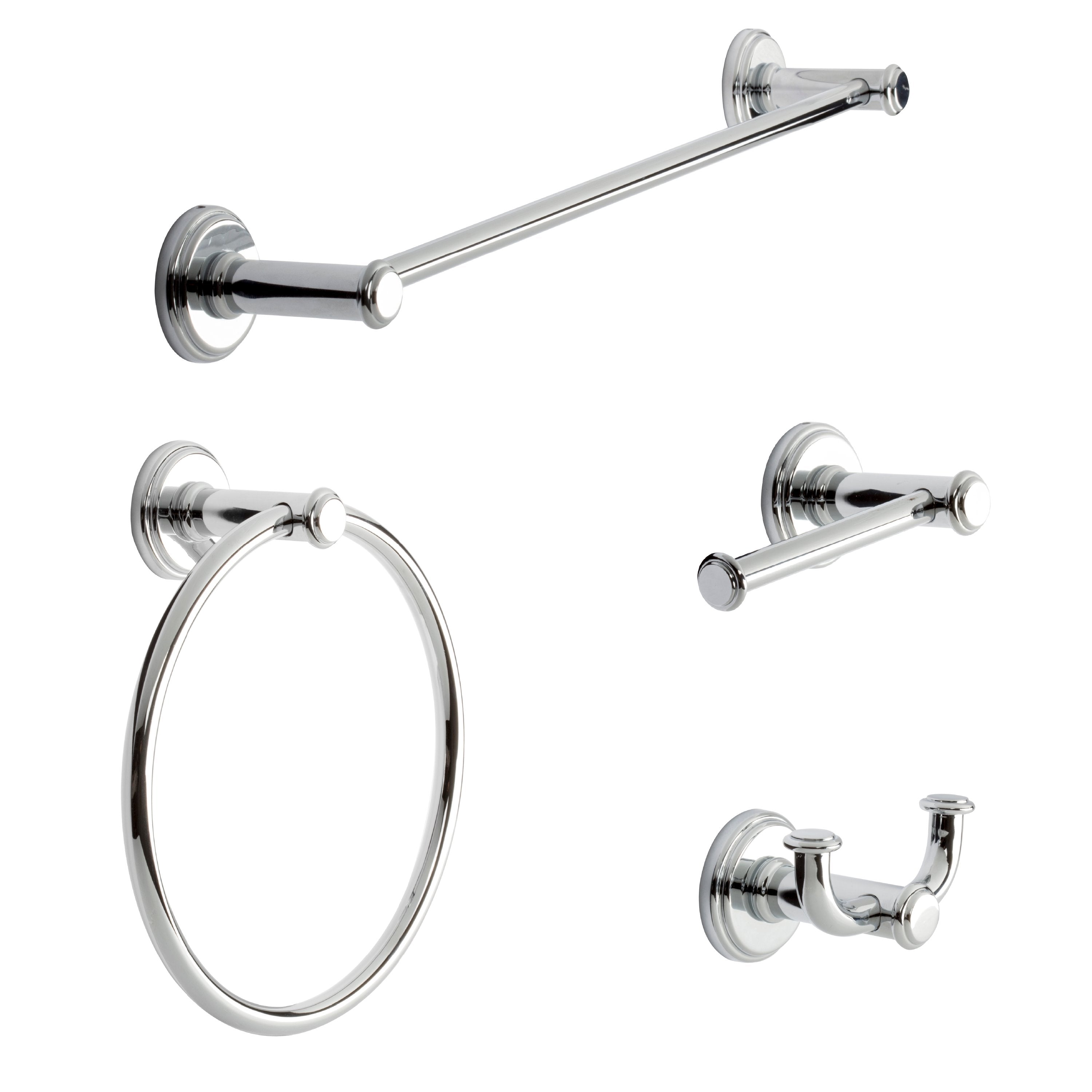 Set accessori completo per bagno/hotel composto da: - Porta asciugamani da 45 cm - Porta asciugamani ad anello - Porta rotolo aperto - Appendiabito doppio Fissaggio con viti (incluse) o con colla (non inclusa)